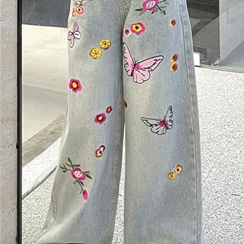 HOT ! Baggy Jeans for Girls Embroidered Butterfly Floral Wide Leg Pants High Waist Elastic Cute Jeans for Girls Colorful Coquette