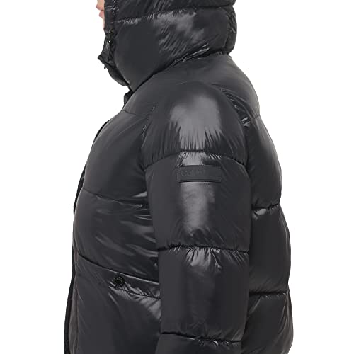 • A touch of luxury: This womens winter jacket has the Calvin Klein logo stitched onto the upper arm and designer signature details on the front snap closure