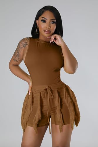 Two Piece Outfits for Women Casual Solid Sleeveless One Piece Tank Tops Fringe Pants Drawstring Shorts Jumpsuits 2