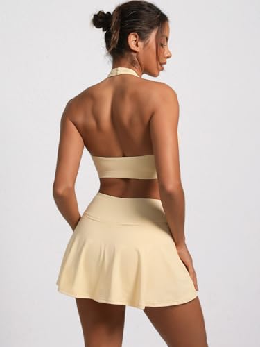 • TWO PIECE TENNIS SKIRT SETS FOR WOMEN: Sexy summer halter V neck bra tops & A line mini skirts with shorts,comfy cozy fit; Tennis skirt sets women 2 piece outfits for pickleball,golf,gym workout,going out club,dance,rave festival,concert or vacation