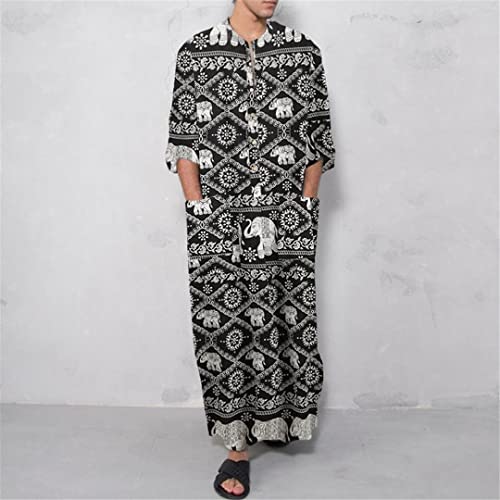 More information about Islamic Jubba Thobe Muslim Men Robe Casual Loose Ancient Script Elephant Print Ethnic Arabic Long Sleeve One Piece Kaftan