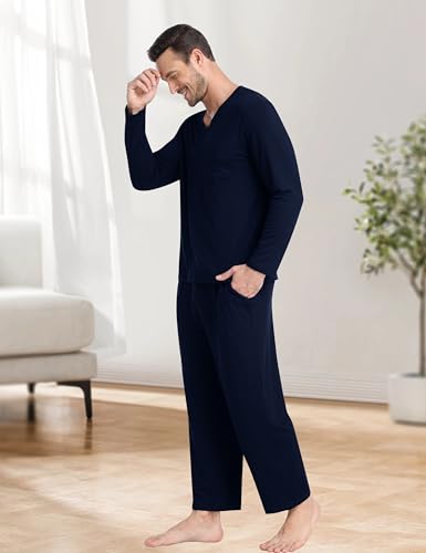 MoFiz Men's Long Sleeve Pajama Set Soft Lightweight 2-Piece Sleepwear V-Neck Pjs for Nightwear Home Lounge with Pockets 1