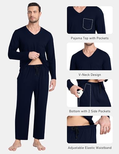 MoFiz Men's Long Sleeve Pajama Set Soft Lightweight 2-Piece Sleepwear V-Neck Pjs for Nightwear Home Lounge with Pockets 2