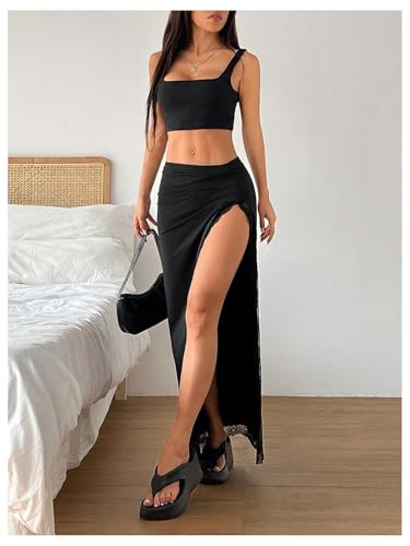 Women's Lace Skinny Bodycon Maxi Skirt Ruched Drop Waist Asymmetrical Long Skirts with Slit 1