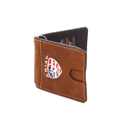 HOT ! ARIAT Men's Leather Bifold Money Clip Wallet with American Flag Shield Embroidery