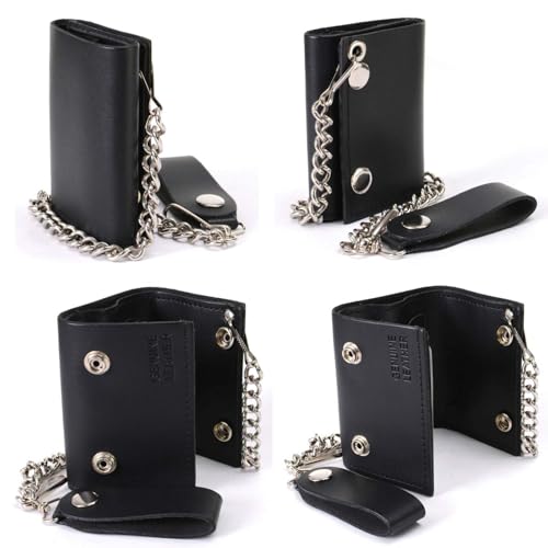 • ✅ Material | Our Men’s wallet with chain is made from full-grain premium genuine leather. This Men’s trifold black wallet has a leather snap belt clip & comes with a 10 gauge, 14” steel chain that can be attached to a belt loop or other secure point to prevent loss or theft while riding your motorcycle