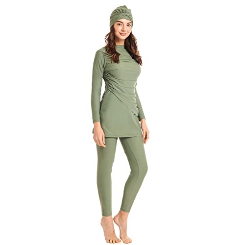• FULL COVER DESIGN: Full length Islamic Burkini wimsuit provides total body cover. Preventing your body from sunburn, and scratched by other biological irritants. Swimsuit will sticks to your body while in the water but then becomes loose when you are out of the water. 3 Pieces (Top, Swim Cap, Pants)Muslim long sleeve swimwear for women is a practical, stylish and modest swimwear, help you to enjoy the sunshine and fun on the beach comfortably.