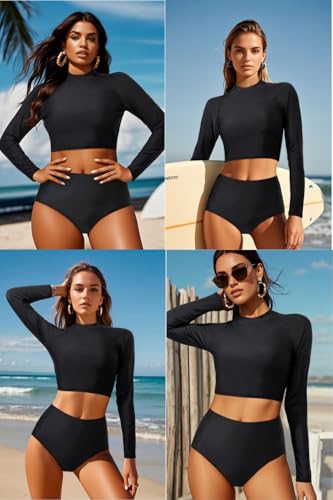 • Two Piece Rash Guard Women: This long-sleeved crop top rashguard is accompanied by high-waisted black shorts. The raglan sleeves with a color block design add a touch of allure and style.