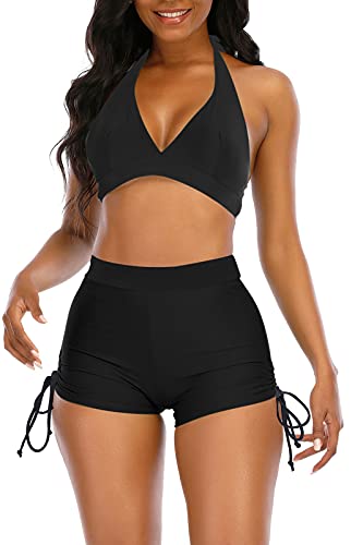 Womens High Waisted Swimsuits with Boy Shorts Brazilian Triangle Top Stripes Halter Bikini Two Piece Bathing Suits 3