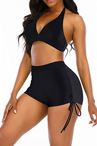 Womens High Waisted Swimsuits with Boy Shorts Brazilian Triangle Top Stripes Halter Bikini Two Piece Bathing Suits 2