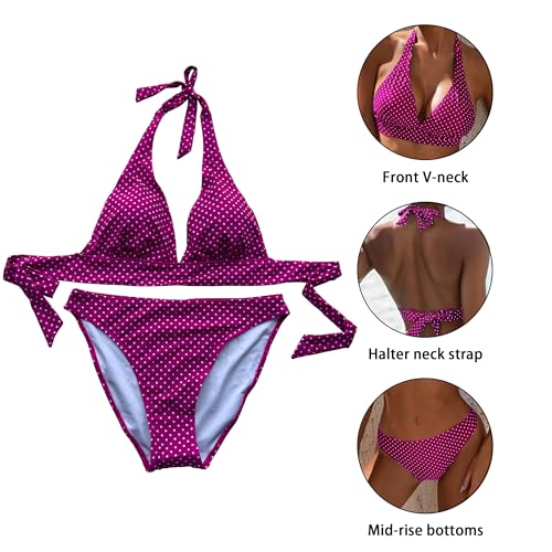 Women's Mid Rise Bikini Suit Halter Neck V Tie Push Up Front Classic Polka Dot Two Swimsuit 1