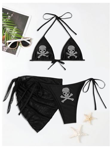 • Features: 3 piece swimsuits for women, bikini set with a coverup skirt, skull print, rhinestone decor, triangle cups, halter neck, self-tie fastening