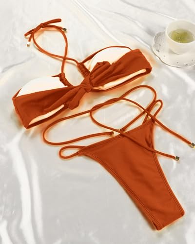 More information about Women Cheeky Bikini Set Halter Thong Solid Color Adjustable Cinched String Two Piece Brazilian Swimsuit Triangle Bathing