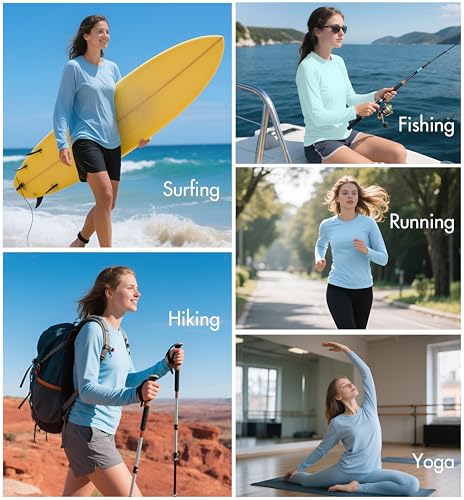 • 【Occasion】NebuKinex sun shirts for women provides UPF 50+ sun protection, making it perfect for outdoor activities such as Hawaii vacations, beach outings, surfing, swimming, fishing, kayaking, hiking, camping, and working in hot weather. these workout shirts women lightweight and cool fabric ensures a comfortable fit, making it an ideal choice for indoor workouts such as running, yoga, Pilates