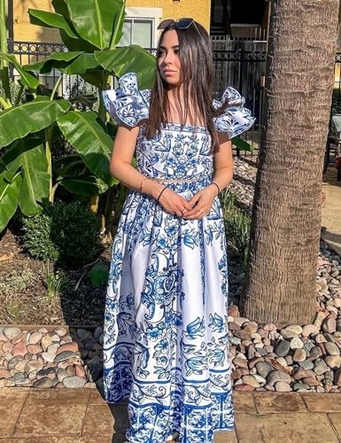 FLAXMAKER Ruffle Porcelain Pattern Majolica Print Back Elastic Band Bikini Swimsuit and Skirt/Sarong 6