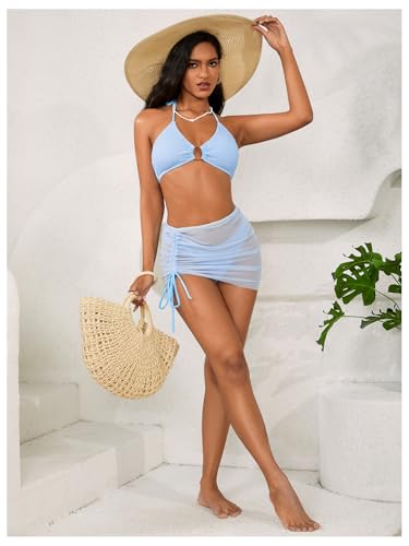 MakeMeChic Women's 3 Piece Bathing Suits Halter Ring Bikini Set with Cover Up Skirts 3