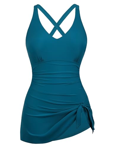 • The V-neckline with adjustable cross-back straps provides customizable chest support, and the fully lined swim dress features a tummy control mesh lining