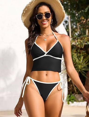 ZAFUL Women's Halter Tankini Swimsuits Cute V Neck Tummy Control Bathing Suit High Cut Tie Side Thong Tankini Set Swimwear 2