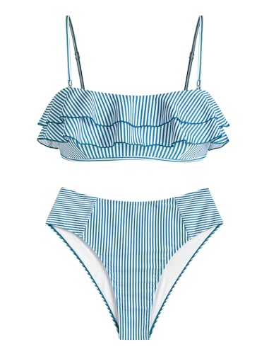 ZAFUL Layered Ruffle Bikini for Women High Waisted Bikini Sets Spaghetti Bandeau Swimsuits Padded Bathing Suit 2