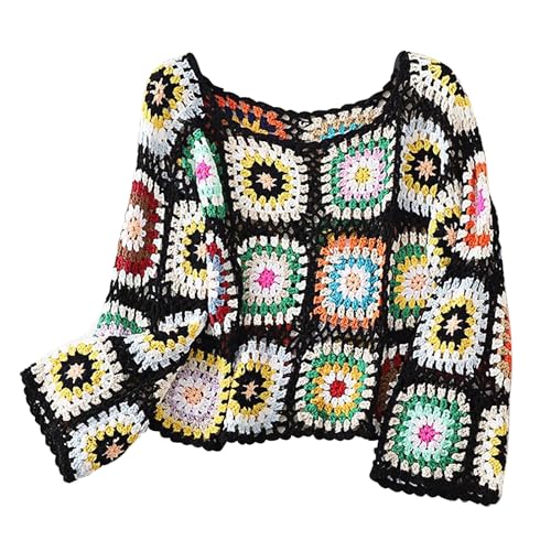 Crochet African Flower Granny Square Pullover Colorful Block Sweater Knitted Cover Up Hollow Out Long Sleeve Beach Outfits 7