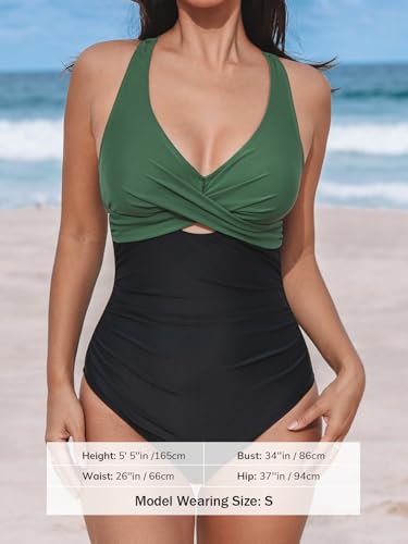 • Design: This classic color block one piece bathing suit features V neck, wrapped front cutout and back crisscross adjustable strappy. Ruched design gives you a flattering fit.