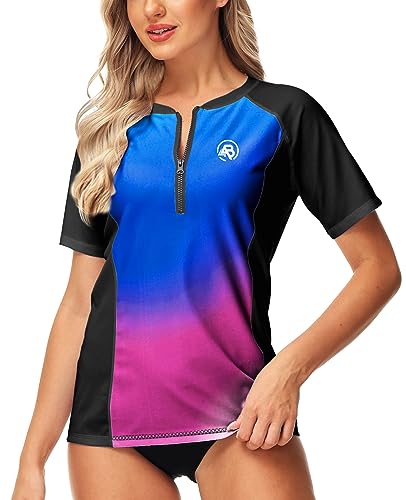 AOBUTE Women Zip Rash Guard UPF 50+ Gradient Short Sleeve Swim Top Surf Shirts 7