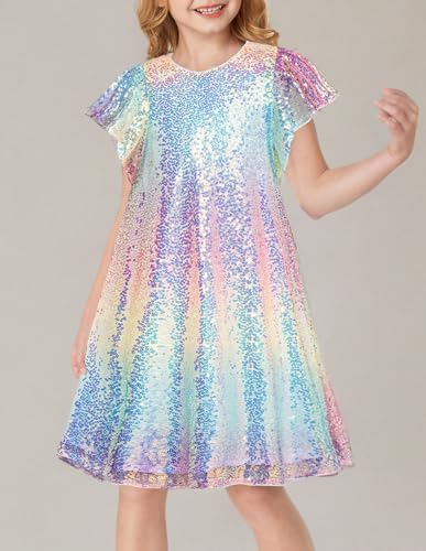 GRACE KARIN Girls Sequin Dress Short Flutter Sleeve Flare Silhouette Midi Dress with Hairbow 5-12Y 6