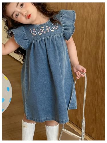 WDIRARA Toddler Girls Cute Floral Embroidery Ruffle Cap Sleeve Denim Short Dresses 4