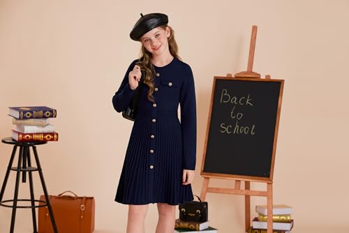 • 2025 Girls' Fall Dress:This long-sleeve knit Sweater dress combines elegance and charm with metallic buttons down the front placket. Accented by textured ribbed details at the waist and cuffs, it flows into a playful pleated skirt. Medium-stretch fabric ensures all-day comfort and freedom of movement. The versatile round-neck, midi-length design suits everyday wear effortlessly
