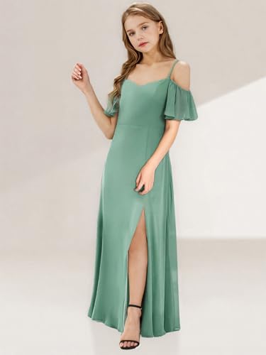 • Elegant Design: dance the night away in chiffon junior bridesmaid dresses. This flower girl dress features an off shoulder neckline paired with spaghetti straps, the short flutter sleeves are flowy and graceful. The look of girl's maxi dress is complete with an A-line floor-length skirt and leg slit