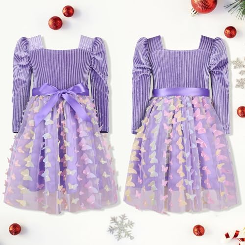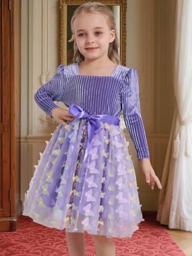 More information about Little Girls Velvet Dresses Butterfly Layered Tulle Dress Long Sleeve Square Neck Tutu Dress Party Princess Dress 4-10Y