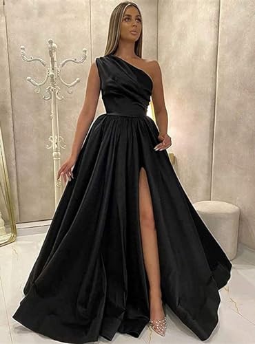 • Features: One Shoulder Prom Dresses 2024, High Side Slit/Split, A Line, Ruched Bodice, Satin, Floor Length, with Pockets, Zipper Back, Sleeveless, Built-In Bra