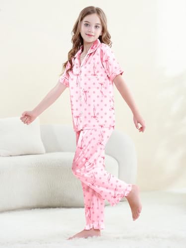 QZH.DUAO Silk Satin Pajamas Set Girls 2 Piece Pj Sets Ruffle Short Sleeve Sleepwear Soft Button Down Loungewear for Kids 2
