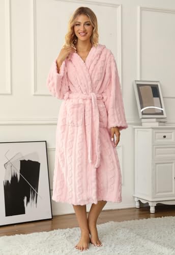 HOT ! Umeyda Girls Bathrobe, Cute Comfy Soft Fleece Hooded Bath Robe With Belt Pockets, Twist Pink, M