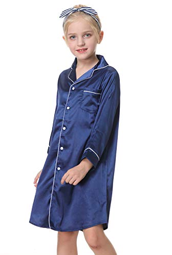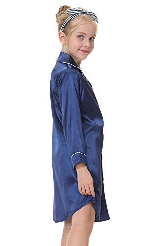 CattyGirl Children's Nightgown Polyester Silk Satin Sleepwear Girls Long Sleeve Nightdress Pajamas Navy 7