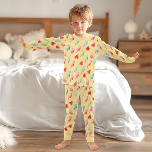 Cartoon Pajamas Set Popsicle Watermelon Yellow Background Pattern Long Sleeve PJs Cotton Jammies Sleepwear Top and Pants 2