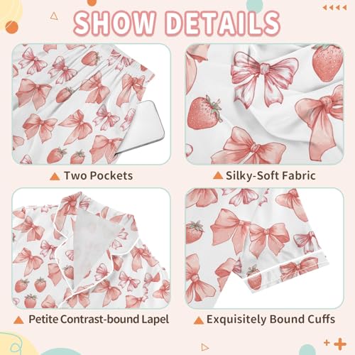 Pink Bows Strawberries Pattern Summer Satin Pajama Set, Cute Button-Down Sleepwear Pj Set for Sleep Wears 4