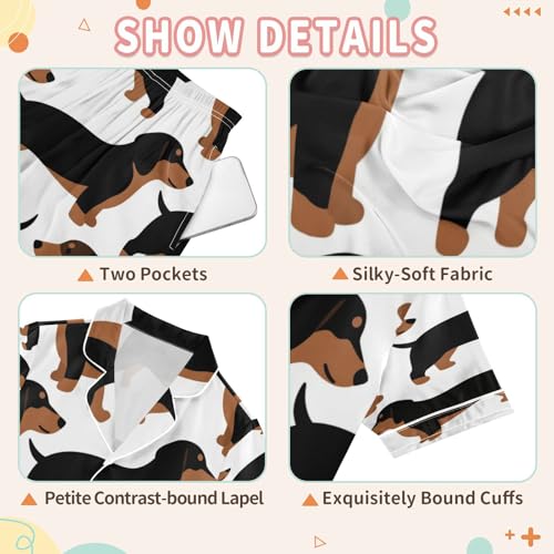 Satin Pajama Sets Short Sleeve Dachshund Pattern Print on White Button Down Silky Nightwear 2 Piece PJS 5-14Y 6