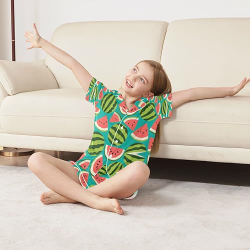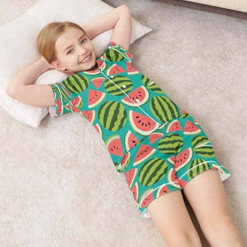 Satin Pajama Sets Short Sleeve Watermelon Slices on Teal Background Button Down Silky Nightwear 2 Piece PJS 5-14Y 6