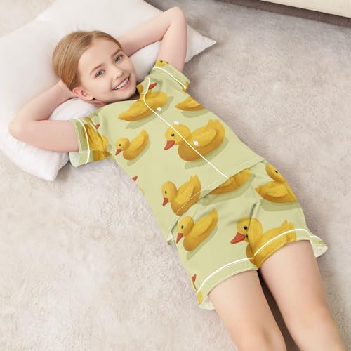 Satin Pajama Sets Short Sleeve Yellow Rubber Ducks Pattern Button Down Silky Nightwear 2 Piece PJS 5-14Y 6