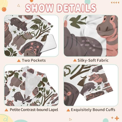 Satin Pajama Sets Short Sleeve Cute Hippo Pattern Print Design Button Down Silky Nightwear 2 Piece PJS 5-14Y 2