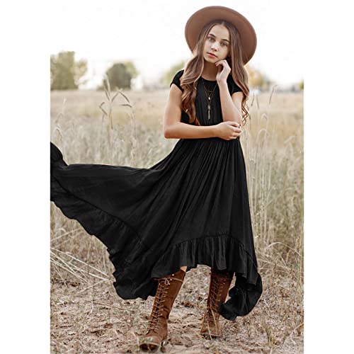 sfdgfhyf 7-12Y Girls Dresses Vintage Rockabilly Sleeve Retro Dresses Girls Party Swing Solid Irregular Dresses Short Dress (c-Black, 9-10 Years) 1