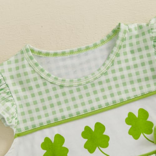 Little Girls St Patricks Day Outfit Shamrock Clover Embroidery Flutter Sleeve Smocked Dress Green Plaid Bows A-Line Dress 4