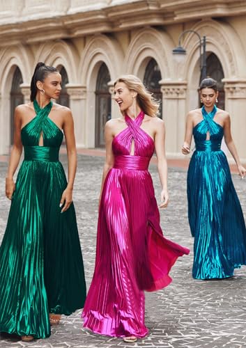 More information about Halter Metallic Sparkly Satin Prom Dress for Teens Pleated Skirt Formal Evening Ball Gown for Women YA034