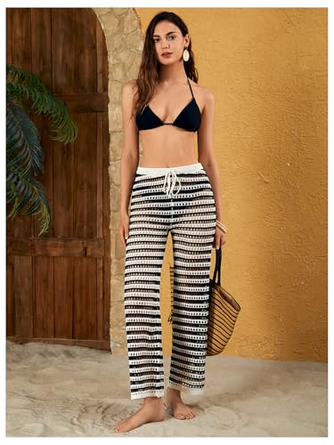 HOT ! Verdusa Women's Hollow Out Crochet Knit Striped High Waist Swimwear Cover Up Pants