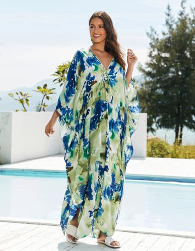 HOT ! Women’s Floral Print 3/4 Sleeve V-Neck Kaftan Dress - Plus Size Beach Bathing Suit Swim Cover-Up