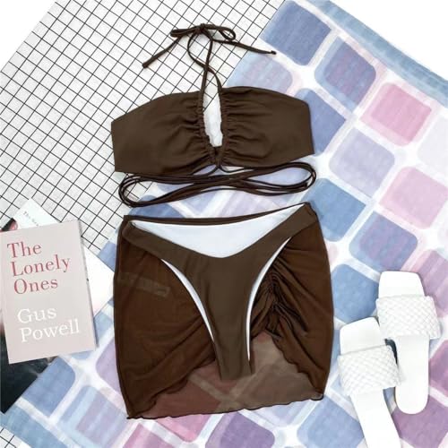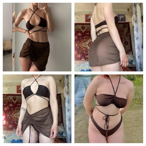 HOT ! Women's 3 Piece Criss Cross Halter Bikini Set Sexy Cutout Wrap Strappy Swimsuit with Drawstring Mesh Beach Cover Up Skirt