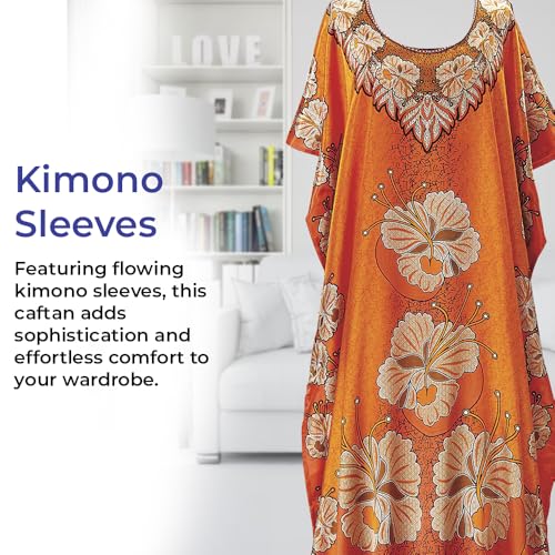 • FLORAL ELEGANCE: Radiate beauty in this deep orange caftan, adorned with bold golden hibiscus blossoms; fluid poly satin drapes beautifully from the scoop neckline to the maxi hemline, creating a luxurious and flattering silhouette