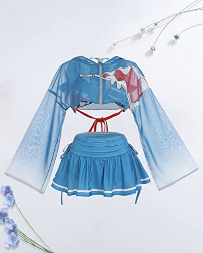 • 🏖3 PIECE BIKINI SET BATHING SUIT:The anime bathing suit comes with a cross back bikini top, high waist bikini bottom with skirt, Gawr Gura Swimsuit Cover Up.