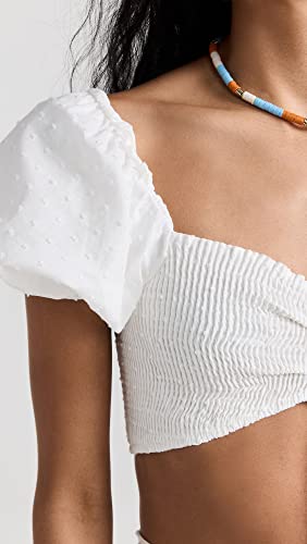 • Sweetheart neckline, Short puff sleeves with elastic cuffs, Smocked elastic bodice, Cropped profile